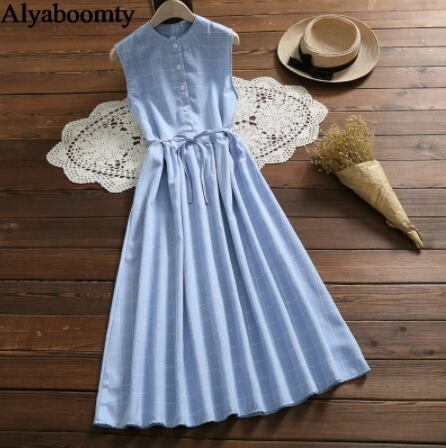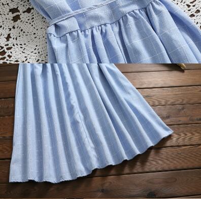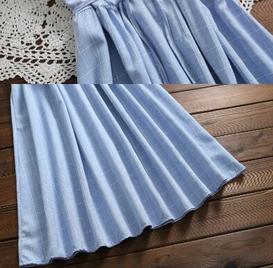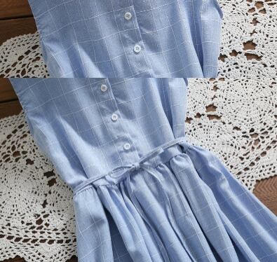 【森ガール】 韓国風 ワンピース 青 チェック柄 ノースリーブ カジュアル レースアップ エレガント 水色 【夏】