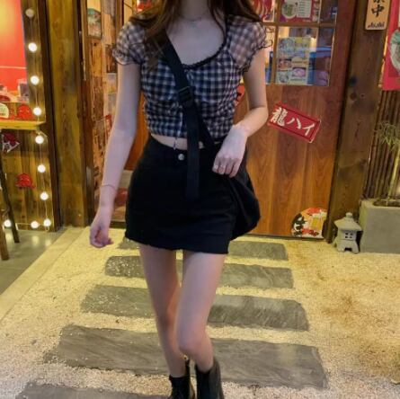 【韓国】トップス ショート丈 黒 チェック柄+レース クロップドトップス【スクエアネック】